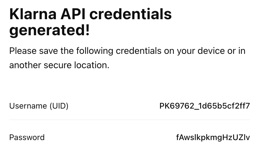 3. IMPORTANT: Copy the username and password from your Klarna API credentials. You can only see the username and password once, so it´s important to copy the credentials as it is needed later in Storeshop.